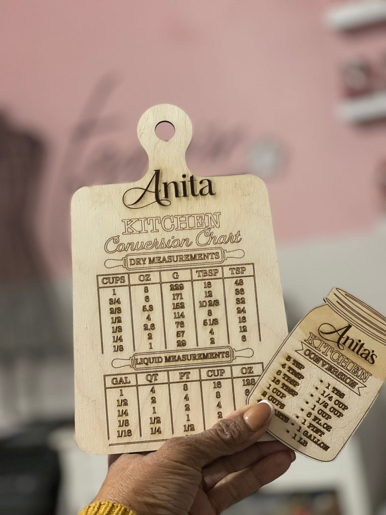 A beautiful and practical kitchen essential, this engraved wooden kitchen conversion chart is designed to be both functional and decorative. Personalized with tour desired name, it adds a thoughtful, custom touch to any kitchen while keeping everyday measurements within easy reach.